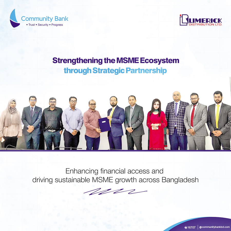 Community Bank Bangladesh PLC and Limerick Distribution Ltd (LDL) have signed a Memorandum of Understanding (MoU), marking a significant milestone in strengthening financial support for Micro, Small, and Medium Enterprises (MSMEs) across Bangladesh. Kimiwa Saddat, Managing Director (Current Charge) of the bank, signed and exchanged the MoU with R. M. Nazmus Sakib, Managing Director of Limerick Distribution Ltd, at the head office of the bank. Dr. Md. Ariful Islam, Head of Corporate Banking & Head of Business (branch) of the bank, and Mustafa Al Mamun, Senior AGM of Limerick Distribution Ltd, were also present.