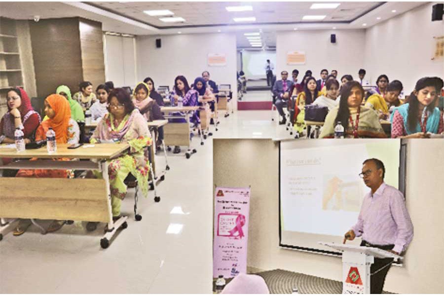 Senior Consultant General of Apollo Hospital Dhaka Professor Dr. S.M. Abu Zafar (inset) addressing at a session on 'Breast Cancer Awareness' at the Knowledge Centre of Shimanto Bank Ltd in the city recently. Female officers of the bank participated at the session supported by Apollo Hospital Dhaka