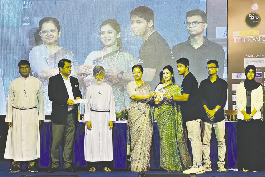 Eastern Bank, in collaboration with St. Joseph Higher Secondary School, organised Technovation'25, a youth tech innovation festival, on the school campus in Dhaka recently. Qazi Mutmainna Tahmida, Additional Director of the Financial Inclusion Department at Bangladesh Bank, is seen handing over a trophy to a competition winner at the prize giving ceremony. Also present were Sarmin Atik, EVP and Head of Liability and Wealth Management at EBL, and Br. Leo James Pereira, Principal of St. Joseph Higher Secondary School. Throughout the festival, students showcased their talents in hackathons, coding challenges, app and web development, robotics, Olympiads, and e-sports competitions.
