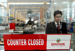 New Delhi : In this file photograph taken recently, an Indian customer service representative stands behind the closed window of a Kingfisher Airlines booking counter at Indira Gandhi International airport in New Delhi. — AFP Photo