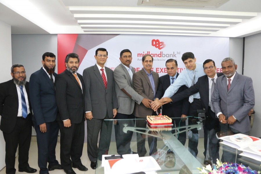 Midland Bank Limited Executive Committee (EC) Chairman Rezaul Karim cuts a cake marking the 100th EC meeting
