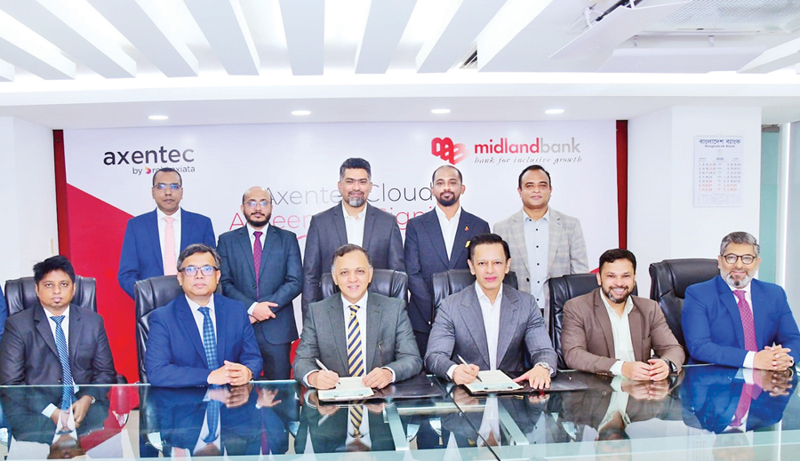 Midland Bank PLC has signed an MoU with Axentec PLC, a subsidiary of Robi Axiata, to adopt advanced cloud technology for its data center management and computing needs. The signing ceremony was held at the head office of Midland Bank in Gulshan-2, Dhaka. Imtiaz U Ahmed, Managing Director & CEO of Midland Bank, and Md. Adil Hossain Noble, Managing Director & CEO of Axentec, signed the agreement on behalf of their respective organisations. Md. Nazmul Huda Sarkar, Deputy Managing Director and CTO of Midland Bank, and Istiaque Ahmed Bhuiyan, Senior General Manager, Advance Networking and Cloud Business of Axentec, were also present.