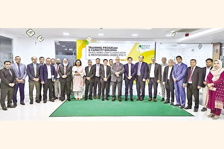 Modhumoti Bank PLC organized "Training & Capacity Building Program on ECL Based Loan Classification & Provisioning under IFRS-9" at the bank's head office on Wednesday. The event was attended by Md. Shafiul Azam, Managing Director & CEO of Modhumoti Bank PLC, as the chief guest. Shahnawaj Chowdhury, Additional Managing Director, and Arab Fazlur Rahman, Deputy Managing Director & Chief Business Officer, were present as the special guests. Binoy G. Roy, FCA, Consultant of Howladar Yunus & Co., Chartered Accountants, conducted the training program, where MANCOM members, divisional heads and related officials of the bank were also present. As per directives of Bangladesh Bank, steps towards implementing `IFRS 9 - Financial Instruments', more specifically the Expected Credit Loss (ECL) based loan classification and provisioning, were thoroughly discussed in the training program. Following the substantive discussions, the programme concluded with a constructive and interactive Q&A session.