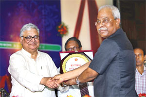 Economic Affairs Adviser to the Prime Minister Dr Masihur Rahman handing over the \'Highest Tax Payer -2014\' trophy to Chairman of BRB Group Md Mozibar Rahman at the National Income Tax Day arranged by the Khulna Tax Zone recently.