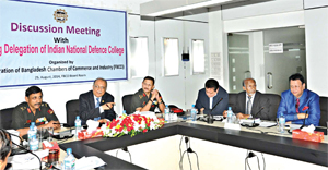 FBCCI President Kazi Akram Uddin Ahmed speaking at a discussion organised by the FBCCI with a 14-member delegation of the Indian National Defence College in the city Monday. Major General Anurag Gupta led the delegation. FBCCI directors were present on th