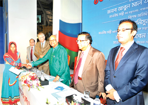 Photo: Finance Minister AMA Muhith handing over the scholarship awarding letters to one of the students at a function organised by Dutch-Bangla Bank Limited (DBBL) in the city Saturday. Chairman of the board of the directors of DBBL Sayem Ahmed and Managi