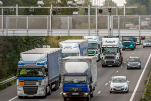 Photo: FRANCE : Trucks drive under an ecotax control portal in Carvin