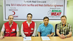 From Left: Financial Delegate of the Turkish Red Crescent Society Bangladesh Suleiman Bal and Head of the delegation Halim Sertac Acici and Managing Director of Bengal Meat Processing Industries Limited Mazharul Islam and Director (Technical & Industry)