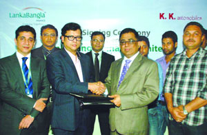 SVP & Head of Retail Finance of LankaBangla Finance Ltd (LBFL) Khurshed Alam and CEO of KK Automobiles SM Faisal Kabir exchanging documents after signing a MOU on behalf of their respective organisations in the city recently. Under the deal, the customers