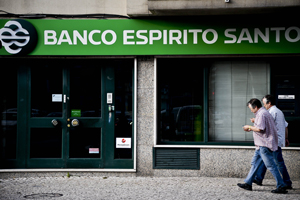 LISBON, Portugal: Two men passing by an agency of BES (Espirito Santo Bank) Bank here on Friday. The crisis engulfing Portugal\'s Espirito Santo Group deepened on the day, as two other units filed for bankruptcy. — AFP Photo