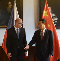 PRAGUE, Boheme, Czech Republic: Czech Prime Minister Bohuslav Sobotka (left) chats with Chinese Vice Premie Zhang Gaoli during the \"Local Leaders Meeting / China Investment Forum\" on August 28, 2014 at the Prague Castle. — AFP Photo