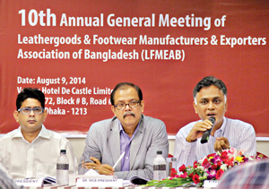 President of the Leathergoods & Footwear Manufacturers & Exporters Association of Bangladesh (LFMEAB) Syed Nasim Manzur speaking at its 10th annual general meeting at a city hotel Saturday. Senior vice president of LFMEAB Md Saiful Islam, vice president (