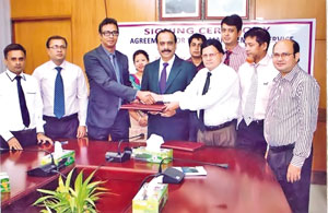 Abdul Aziz, chairman, Rimex Footwear Limited, and Md Moshiur Rahman, CEO, ICB Capital Management Limited, exchange documents after signing an agreement in Dhaka recently. Md Fayekuzzaman, managing director of Investment Corporation of Bangladesh (ICB) & C