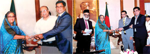Chairman of Standard Bank and President of FBCCI Kazi Akram Uddin Ahmed and Vice Chairman of Standard Bank Gulzar Ahmed (left) and Chairman of Premier Bank Dr HBM Iqbal (right) handing over cheques for Tk 10 million and Tk 5.0 million respectively to Prim