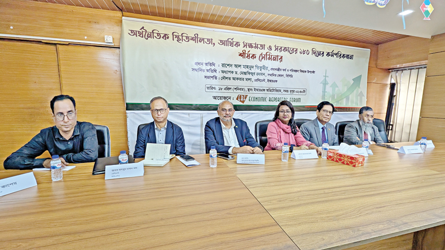 Prime Minister's Finance and Planning Adviser Rashed Al Mahmud Titumir along with other guests attends a seminar titled 'Contemporary Economic Stability, Financial Resilience and the Government's 180-Day Action Plan' held at the auditorium of Economic Reporters' Forum on Saturday. — FE Photo