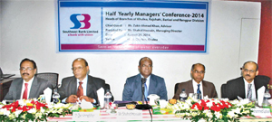 Advisor of Southeast Bank Limited Zakir Ahmed Khan and Managing Director Shahid Hossain seen, among others, at the half-yearly managers\' conference-2014 of the heads of branches of the bank\'s Khulna, Rajshahi, Barisal and Rangpur divisions in Khulna rec