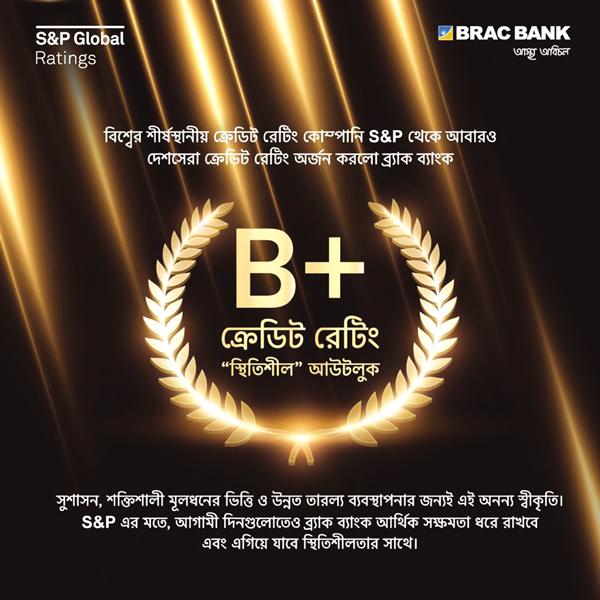 BRAC Bank has once again secured a 'B+' credit rating with a 'stable' outlook, as affirmed by the renowned US-based credit rating institution, S&P Global Ratings, says a press release.
