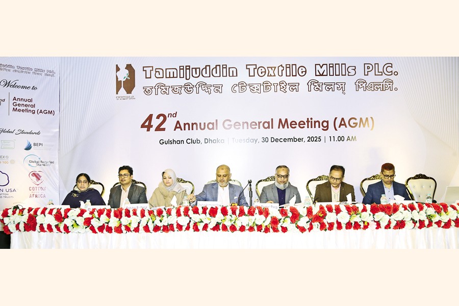 The 42nd Annual General Meeting (AGM) of Tamijuddin Textile Mills PLC was held at Gulshan Club in Dhaka on Tuesday. The meeting was chaired by Chowdhury Mohammad Hanif Shoeb, Chairman of the company. The AGM approved a 12% cash dividend and 10% stock dividend for the shareholders.