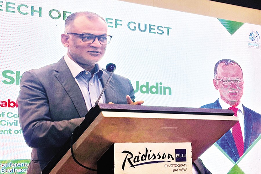 Commerce Adviser Sheikh Bashir Uddin speaks at the closing session of a two-day international conference on 'Future of Business: Innovation, Technology and Sustainable Development' at a hotel in Chattogram on Friday. — PID