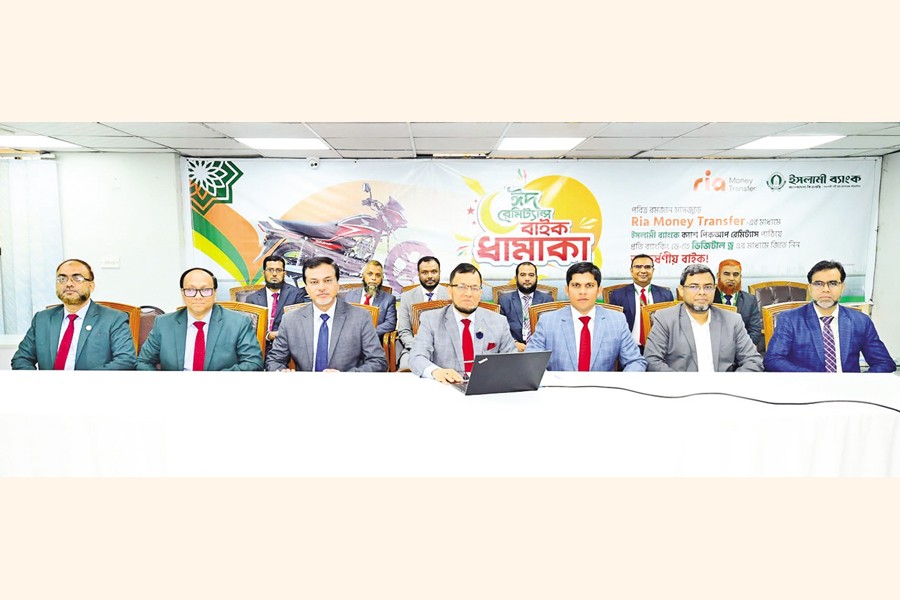 Shabnur Khatun, a client of Nimtola branch of Islami Bank Bangladesh PLC, won the first motorcycle at the cash remittance festival through Ria Money Transfer. She received the award for the remittance sent by her expatriate brother Mohammad Atik living in Brunei. Md. Omar Faruk Khan, Managing Director of the bank, was present as the chief guest at the digital raffle draw held at Islami Bank Tower on Sunday. Md. Rafiqul Islam, Deputy Managing Director, Mohammad Masud, Executive Vice President, Nazrul Islam and Md. Motahar Hossain Mollah, Senior Vice Presidents, Mohammad Shahadat Hossain, Vice President of the bank, and Rashedul Islam Talukder, Country Manager of Ria Money Transfer, Bangladesh also attended the event.