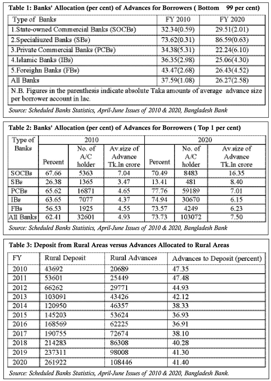 A new look at allocation of advances is of critical importance. Almost the entire sum of bank advances is, indeed, debt capital supplied to several categories of entrepreneurs (borrowers) in different sectors and subsectors of the economy. As per bank statistics on June 30, 2020, the borrowing customers can be divided into two main groups-- (i) more than 99 per cent of the customers with average size of advance Tk.2.58 lac, and (ii) less than 1 per cent of the customers with average size of advance Tk.7.50 crore. Extreme asymmetry is observed between the two groups (hereinafter termed as Bottom 99 per cent , and Top 1 per cent for ease of further references in the discussion). Allocative pattern of advances is indicative of capital concentration, the consequence of which is rise in economic inequality. Which of the two groups should be treated with more equity and justice? Is it wise to carry coal to Newcastle? Is equity maintained across regions?