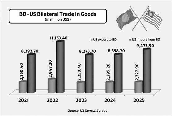 Despite recent global trade shifts and new tariff structures, Bangladesh's share of the US apparel market rose to 10.53 per cent in early 2026, up from 9.26 per cent the previous year. Despite challenges, apparel exports to the US grew by over 15 per cent in the Jan-Oct 2025 period. The U.S. goods trade deficit with Bangladesh was $6.1 billion in 2024. The U.S. services trade surplus with Bangladesh was $926 million in 2024.Despite efforts to increase U.S. exports, the trade balance continues to heavily favour Bangladesh due to high garments export.