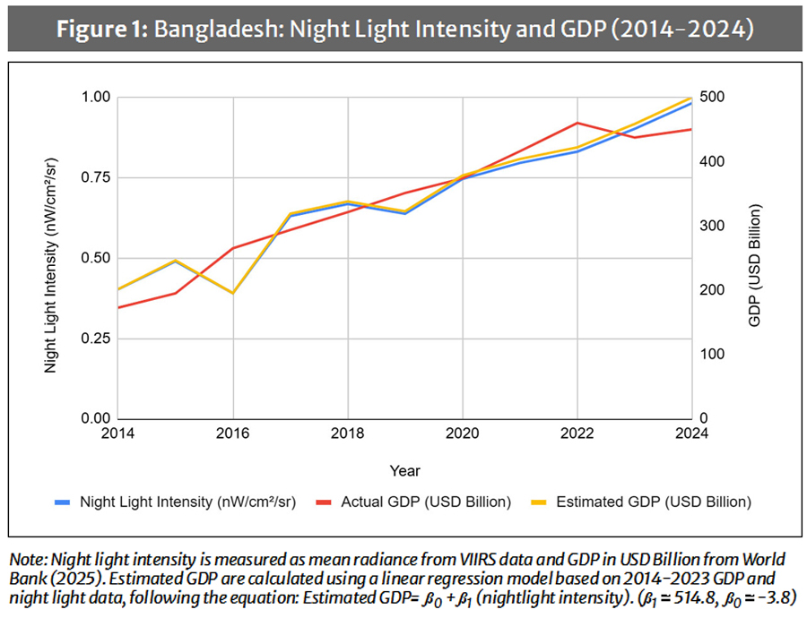 Satellite image of Bangladesh in 2024 at night, in Figure 2, is used as an example to demonstrate the process of analysing economic activity. There is a major difference in nighttime activity between urban and rural areas. It is a direct implication of lower consumption and production in rural areas compared to urban areas. But between the years 2014 and 2024, nightlight intensity rose almost in step with GDP, which can be observed in Figure 1. This tells us that there has been real economic progress in rural areas, despite its being lower than urban areas. Increased consumption and production imply higher income, better living conditions. As the economy grows, the cities become brighter. The glow of cities is a mirror of economic activity. However, is it enough to capture the full story?
