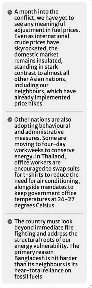 It was entirely predictable that the onset of the Iran-Israel conflict would send shockwaves through the global energy market. With supply chains disrupted, particularly through the Strait of Hormuz, global crude oil prices have nearly doubled. Bangladesh imports roughly 95 per cent of its fuel, almost all of it from the Middle East. Consequently, for an import-dependent economy like ours, this regional war has rapidly escalated into a national crisis.