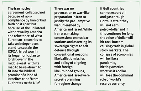 The Iran nuclear agreement collapsed not because of non- compliance by Iran or bad faith on its part but because of the unilateral withdrawal by America and reluctance of West European countries to take an independent stand to sustain the JCPOA. Israel won in its hegemonic plan to lord it over in the middle-east, with its map to be re-drawn to fit into the biblical promise of a land of Israelites tribe ‘from Euphrates to the Nile’. As recently as last fortnight, the American ambassador to Israel said in public that it would be alright if that was going to be the case. Though apparently he seemed to speak off the cuff, the ambassador articulated the view of many American political heavyweights who are beholden to the Jewish lobby AIPAC. The ambassador was not reprimanded by Trump, not to speak of being withdrawn. The Republican Party is Israel’s ideological citadel and no one is more enthusiastic in fulfilling Israel’s imperial dream than president Donald Trump whose decision to withdraw from JCPOA in 2016 has set in motion events that culminated in the pre-emptive attack by America and Israel against Iran on February 28 this year. With the war in its eight day (as of March 8) and a ‘anything can happen situation ‘ unfolding in the ongoing war, it is pertinent to analyse what events and policies have led to this armed conflict that can morph into something that humanity dare not speak its name – the Third World War. In the course of this analysis, the role of countries concerned with this catastrophe, threatening to become biblical armageddon, would be explained as well.