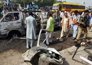 PESHAWAR: Pakistani volunteers searching the wreckage of a passenger van after a bomb explosion here Thursday. — AFP