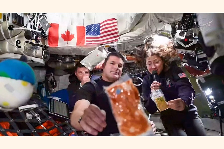 Artemis II mission astronauts (L-R) NASA's commander Reid Wiseman, Canadian Space Agency's mission specialist Jeremy Hansen and NASA's mission specialist Christina Koch during a brief demonstration of the food they eat to respond a question during a "VIP call" with Canadian children on Saturday. — AFP