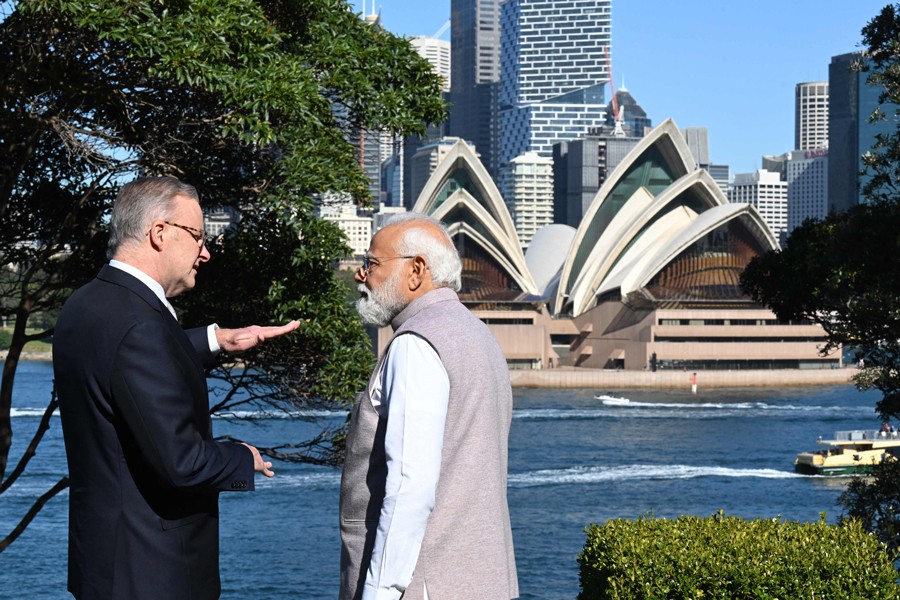India's Prime Minister Narendra Modi (R) speaks with Australian counterpart Anthony Albanese as they stand in front of the Sydney Opera House on Wednesday — AFP