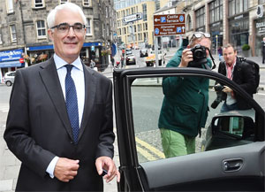 Better Together leader Alistair Darling leaves following a television interview in Edinburgh Sunday. — AFP