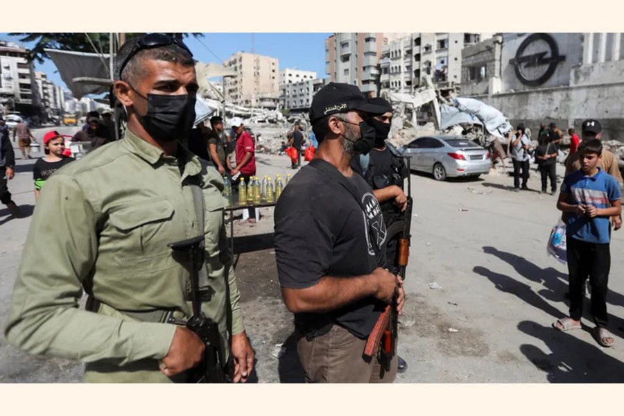 Three Hamas militants wearing face masks and carrying automatic weapons stand guard on a destroyed street in downtown Gaza — Reuters