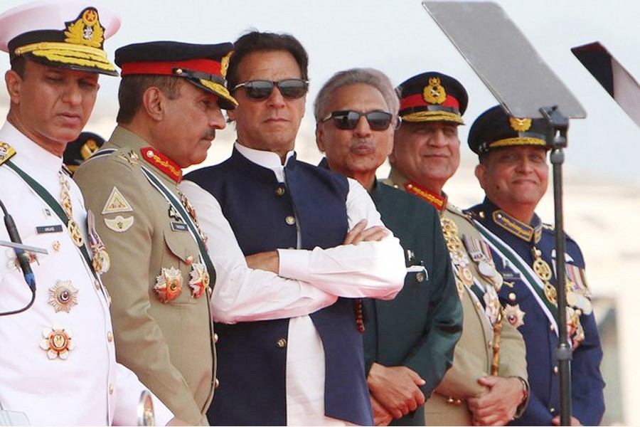 Pakistan's Prime Minister Imran Khan (centre left), and President Arif Alvi (centre right), watch air force fighter jets perform in Islamabad recently — AFP