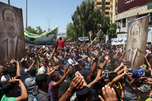 IRAQ : Iraqis hold giant portraits of Iraq\'s Prime Minister Nuri al-Maliki during a demonstration to support him Monday. — AFP