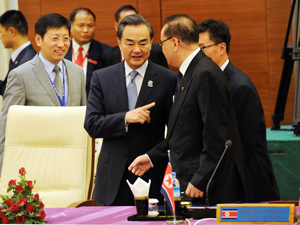 MYANMAR : Chinese Foreign Minister Wang Yi (C) gestures as he talks with North Korean Foreign Minister Ri Su Yong (R) during the Launching Ceremony of the Logo of the ASEAN Regional Forum Disaster Relief Exercises (ARF DiREx 2015) at the Myanmar Internati