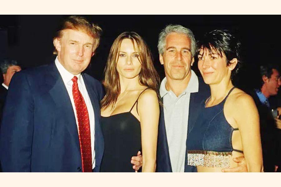 A photo taken in 2000 shows Donald Trump with his girlfriend and future wife Melania Knauss, standing beside Jeffrey Epstein and Ghislaine Maxwell at the Mar-a-Lago club