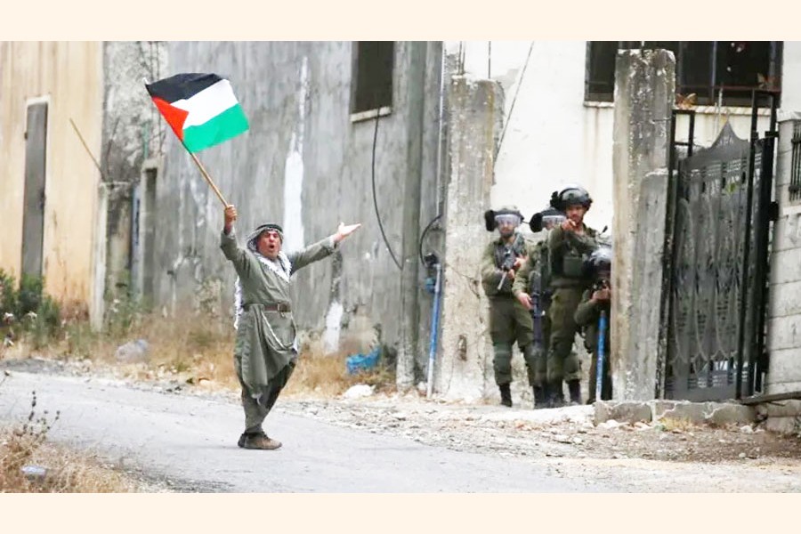 A Palestinian man holds a Palestinian flag aloft in one hand while gesturing towards a group of Israeli soldiers a few feet away — EPA