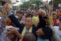 CAMBODIA : MP-elect from the Cambodia National Rescue Party (CNRP), Ho Van raises his hands with supporters as he is released on bail from Prey Sar prison in Phnom Penh Tuesday. — AFP