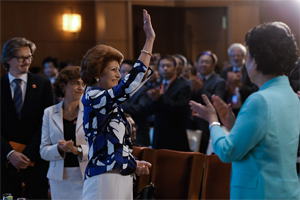 CHINA : Androulla Vassiliou of the European Union Commission waves during the second meeting of the China-EU high-level People-to People Dialogue at the Diaoyutai State Guesthouse in Beijing Saturday. — AFP