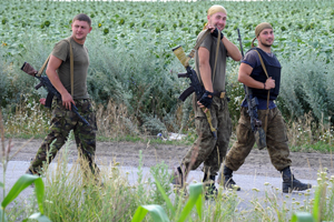 Photo: DONETSK: Ukrainian government soldiers patrolling in a sunflower field