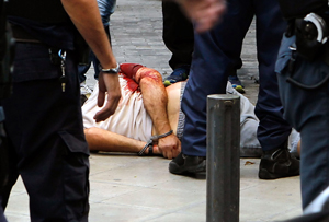 Photo: GREECE : Police officers stand next to handcuffed and seriously injured