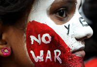 INDIA : An Indian youth activist takes part in a rally to mark Hiroshima Day in Mumbai Wednesday. Peace rallies and memorial services the world over marked the world\'s first nuclear attack on Hiroshima - the moment in 1945 when a single US bomb instantly