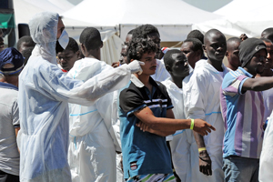 ITALY: Immigrants, part of a group of more than 1,700 people, wait after they disembarked from the Italian military ship \"San Giusto\" Monday in the port of Reggio Calabria, southern Italy, following Mare Nostrum rescue operations at sea. — AFP
