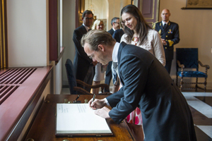 NETHERLANDS : Dutch Prince Jaime de Bourbon de Parme, son of Princess Irene, signs Tuesday a guest book during his swearing-in as Dutch ambassador to the Vatican by Dutch King Willem-Alexander at Noordeinde palace in The Hague. — AFP
