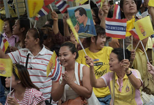 THAILAND : A well-wisher holds a portrait of Thai King Bhumibol Adulyadej as people wait for him to drive by in a motorcade as he leaves the Siriraj hospital in Bangkok Monday. — AFP