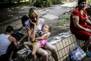 UKRAINE : Refugees wait in front of a hostel building ran by pro-Russian rebels in the center of Donetsk. — AFP