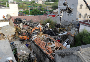 TAIWAN : Rescue workers and firefighters search through the wreckage of TransAsia Airways flight GE222 after it crashed near the airport at Magong on the Penghu island chain Thursday. — AFP