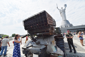 UKRAINE : An Ukrainian serviceman guards as people looks at weapons during an exhibition displaying arms, military equipment and documents seized from the pro-Russian armed groups during an anti-terrorists operation (ATO) in the east of Ukraine Saturday.